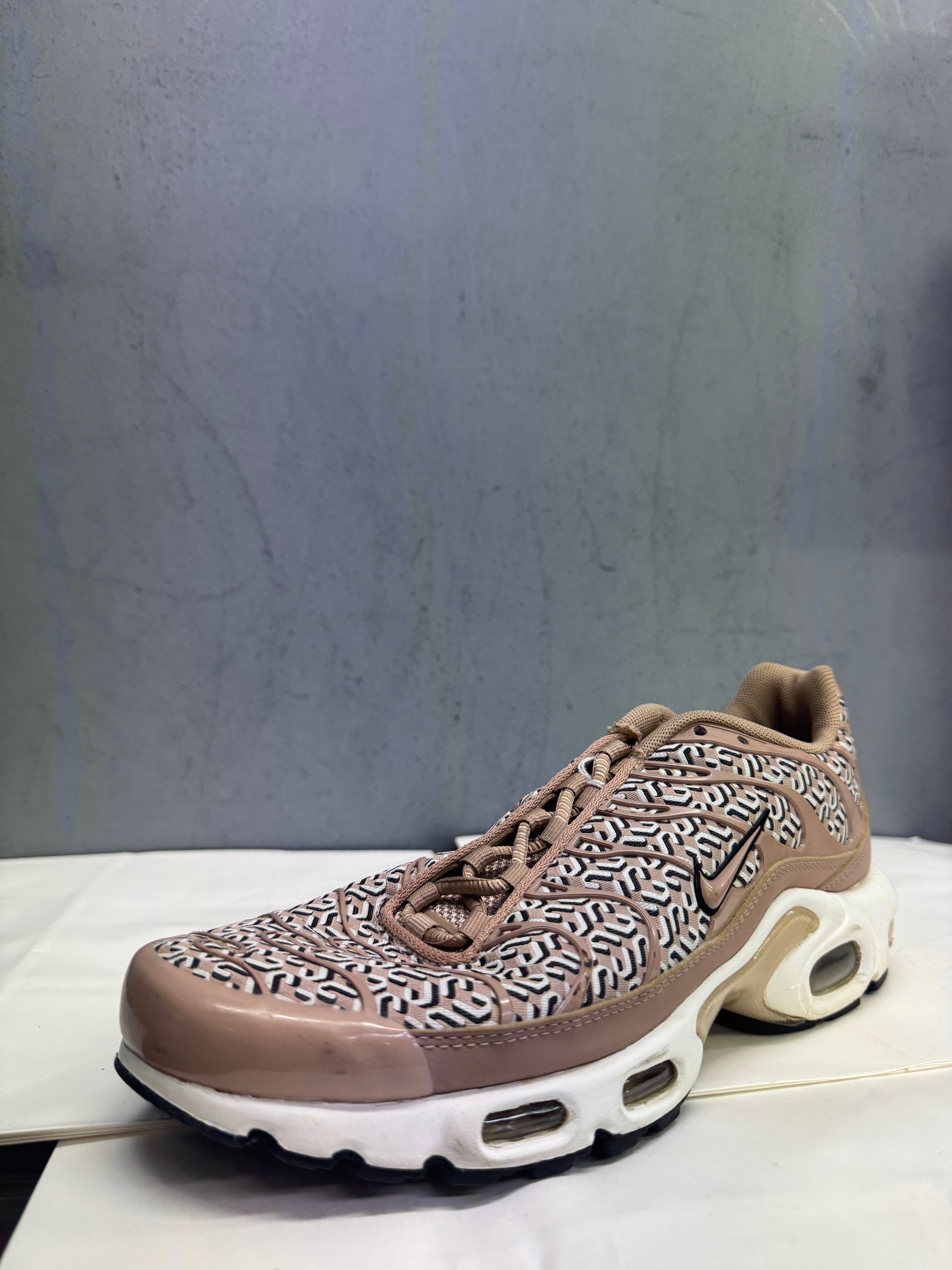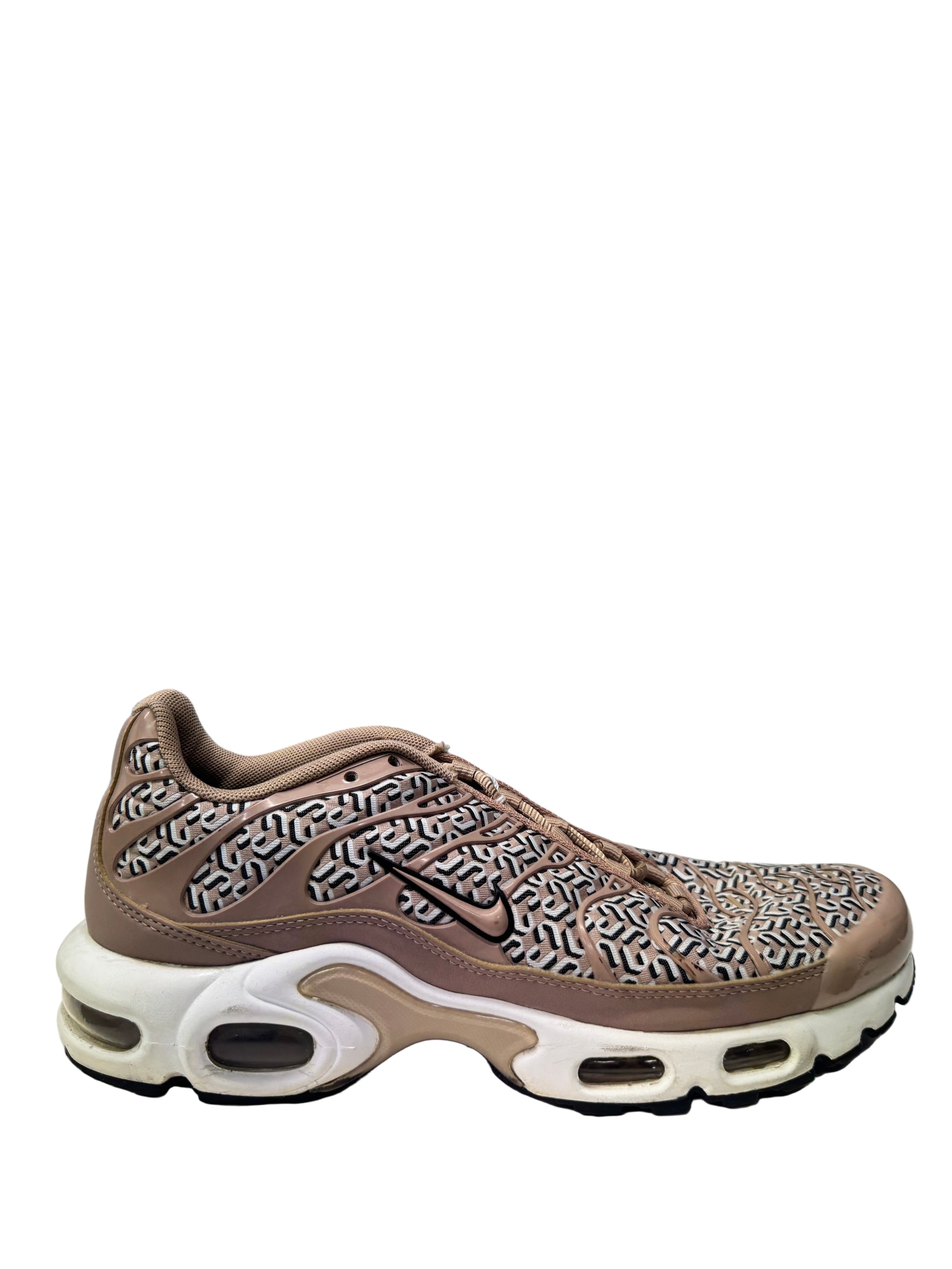 The Used Women’s Nike Air Max Plus “United in Victory” redefines the TN with a luxury-inspired print celebrating unity and strength. A neutral Sail and Light Bone base is covered in an all-over “N” and “U” monogram pattern, paired with black TPU cage overlays and golden Nike branding. Visible Tuned Air units in the heel and forefoot deliver signature comfort, while the sculpted sole completes the design with a refined yet bold aesthetic.